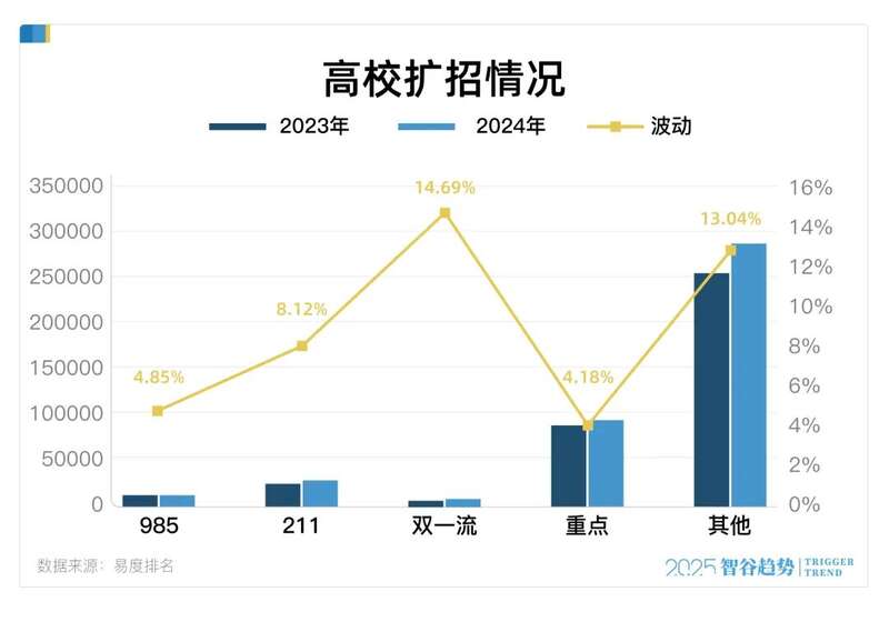 但问题在于,这波扩招的主力并非985、211,而是大量的“其他高校”。易度排名显示,“其他高校”计算机类专业人数庞大,扩招幅度也高达13.04%。
