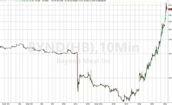 Beyond Meat的股价从上周四收盘时的52美分开始启动。周五,涨势初现端倪,并在本周一加速。据Business Insider报道,一位名为Demitri Semenikhin的交易员在社交媒体上大力宣传该股票,吸引了市场的关注。