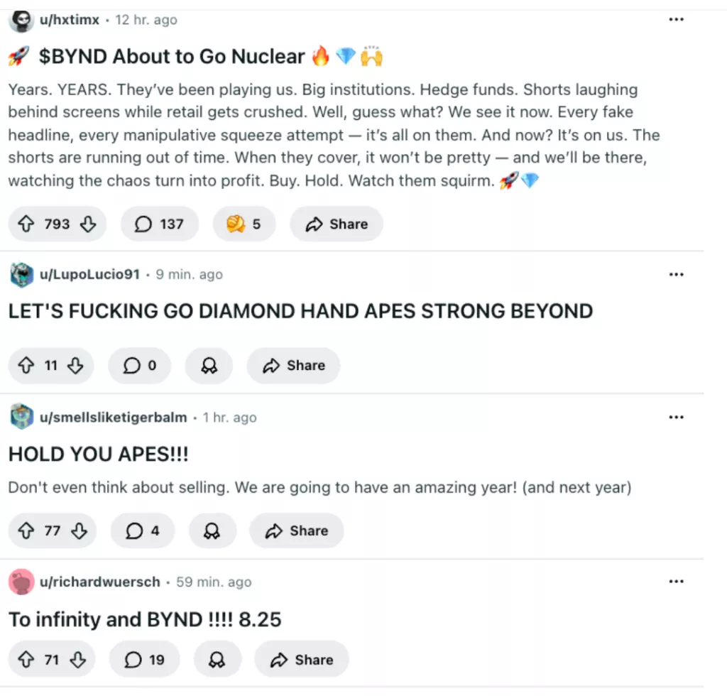 首先是极高的空头仓位。截至9月底,Beyond Meat约64%的可供交易股份已被卖空。另有数据显示,其空头头寸占流通股的比例也超过50%。在社交平台Reddit的r/WallStreetBets论坛上,有用户发帖讨论如何让这只被严重做空的股票“核爆”,以“对抗邪恶的卖空者”。