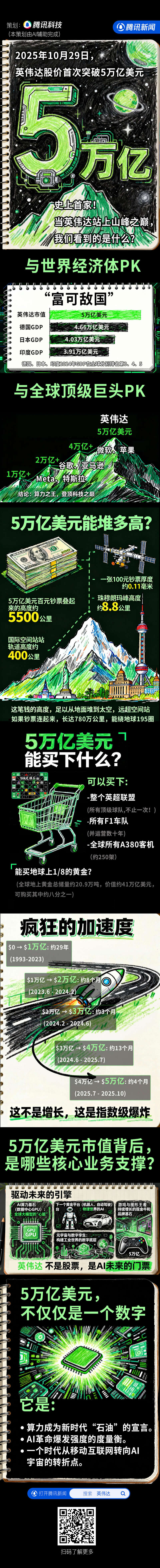 2025年10月29日,英伟达市值破5万亿美元,成为史上首家市值达到此里程碑的公司。