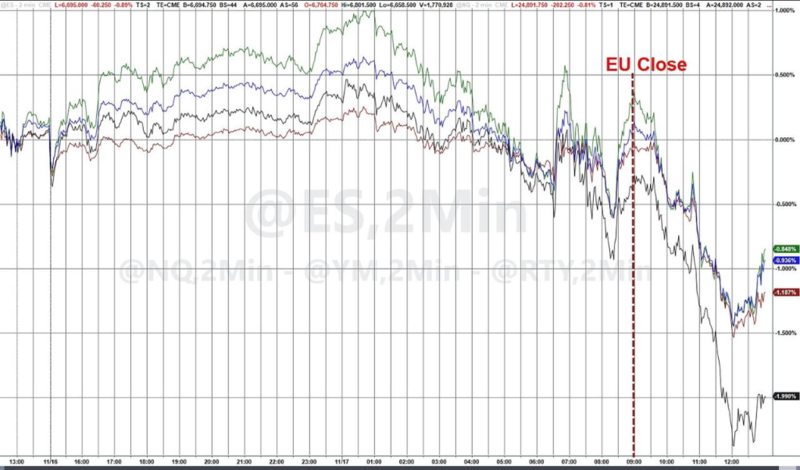 欧元区蓝筹股指收跌超0.9%,成分股爱特思集团、德银、西门子跌超3%。德国股市收跌1.2%,意大利银行板块跌超0.7%。