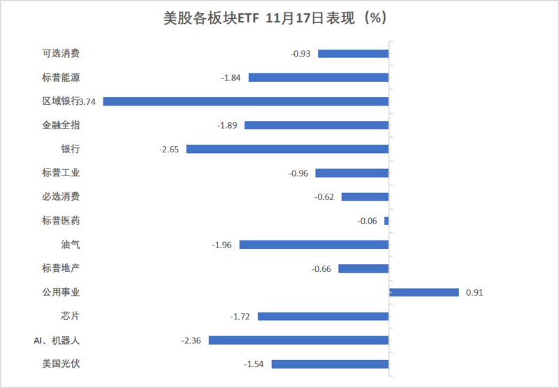 区域银行ETF收跌超3.7%,和银行业ETF领跌美股行业ETF,标普电信板块涨超1.1%。